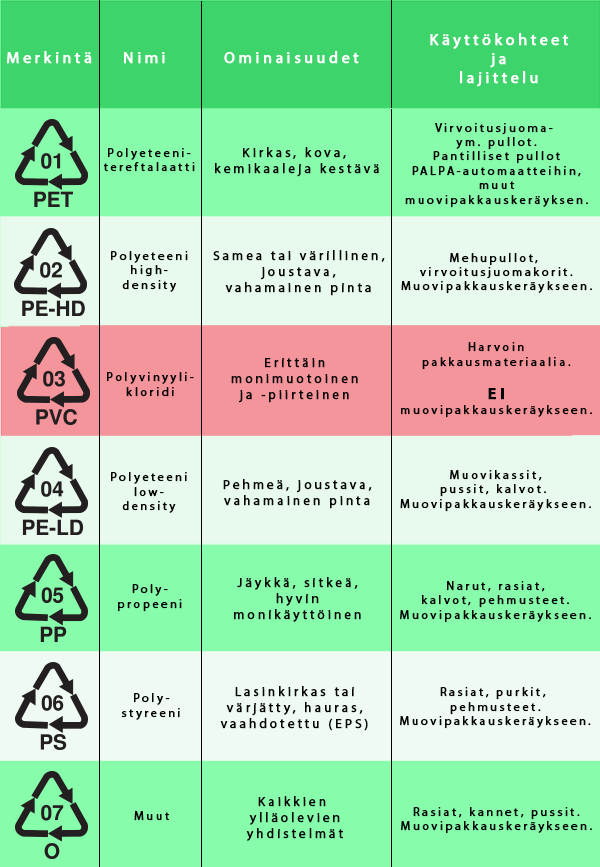 Tavallisimpien pakkausmuovimateriaalien merkinnät ja lisätiedot (lähde: https://sumi.fi/) :